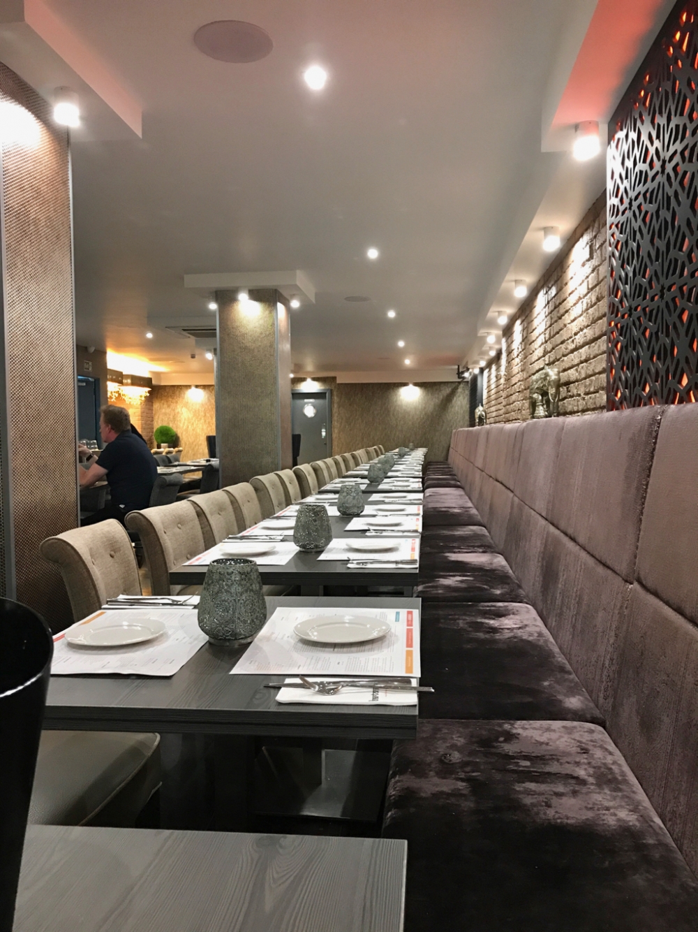 One of the starting dips (£1.75/£2.10) the green one, was particularly pleasing: a lime, mango, coriander affair which our server proudly claimed was of his own making. Less home-made were the Pringle-like poppadoms (£2/£2.40) which you order separately.