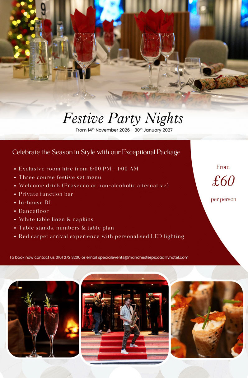 To book or find out more call 0161 272 3200 or email specialevents@manchesterpiccadillyhotel.com