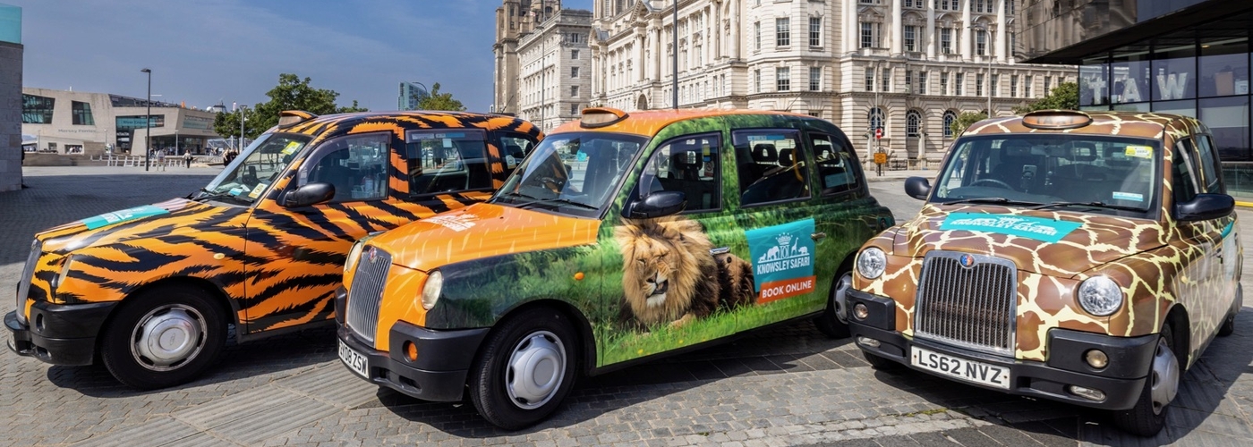 Knowsley Safari has taken over a number of taxis in Liverpool, wrapping them with tiger and giraffe prints. The striking cabs will drive over 3,000 passengers a month within a ten-mile radius of Liverpool city centre and, from 1 August, the first ten passengers to hire each of the three branded cars will receive a free Knowsley Safari summer pass.