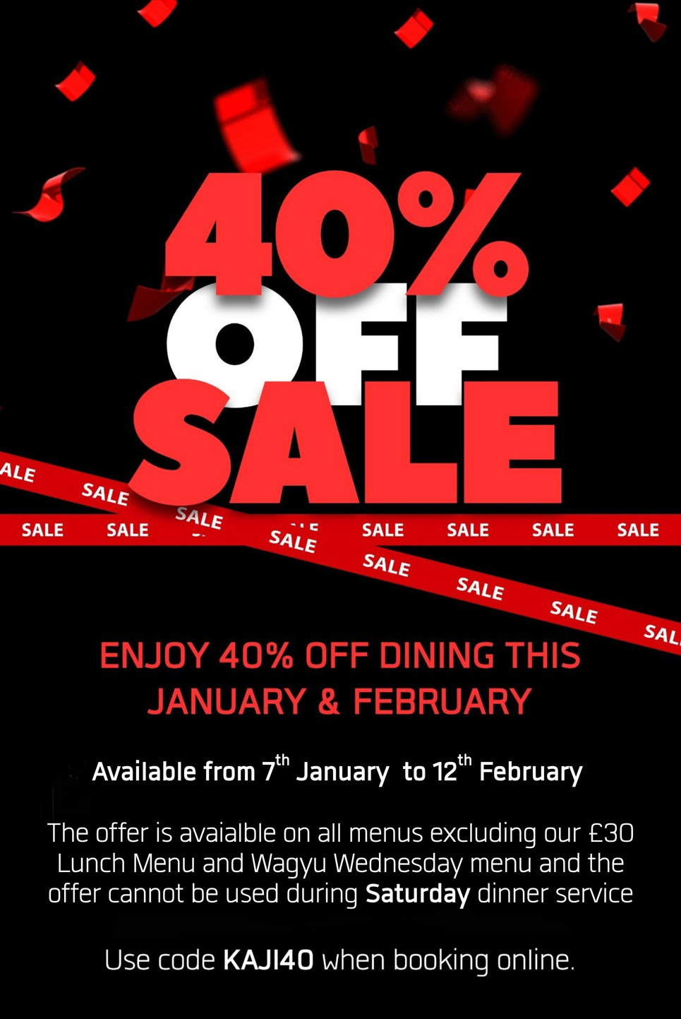 The 40% discount runs until Thursday 12 February and is available at all times except Saturday dinner service.